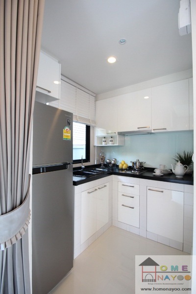 ภาพรวมภายในส่วนครัว >> โครงการตกแต่งไว้ให้เป็นแนวทาง ด้านบนและด้านล่างเคาน์เตอร์ มีตู้เก็บของ ทำให้ประหยัดพื้นที่ห้องครัว และช่วยให้มีพื้นที่ใช้สอย และเก็บของได้มากขึ้นค่ะ