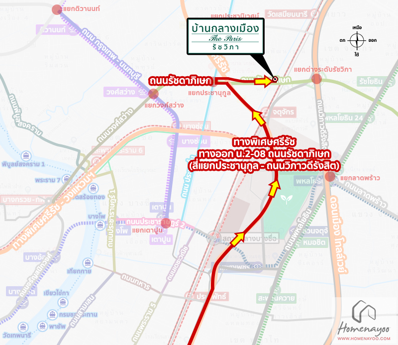 ภาพประกอบการเดินทาง เรามาจากทางพระราม 4 โดยใช้ทางพิเศษศรีรัช หรือ ทางด่วนขั้นที่ 2 มุ่งหน้าไปประชานุกุลให้ลง ทางออก น.2-08 ถนนรัชดาภิเษก (สี่แยกประชานุกูล – ถนนวิภาวดีรังสิต)