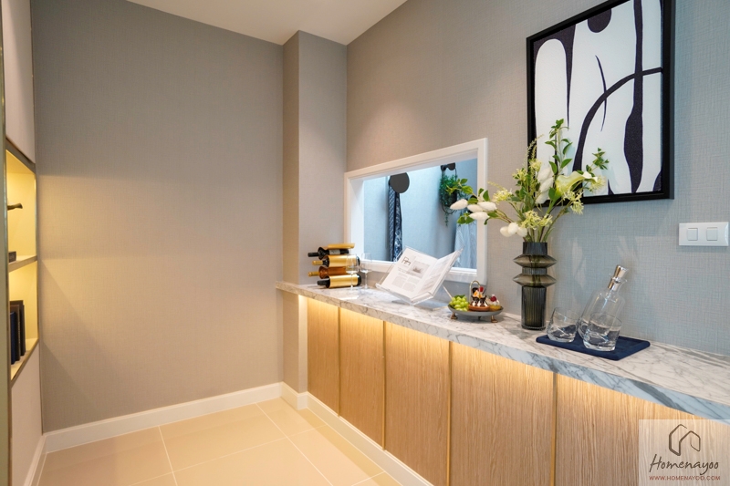 บ้านตัวอย่างจัดเป็นโต๊ะบาร์ตัวใหญ่และเก้าอี้อีก 6 ที่นั่ง สามารถนั่งทำงานพร้อมกันได้หลายคน ก็น่าจะเหมาะกับไลฟ์สไตล์ของคนในปัจจุบัน