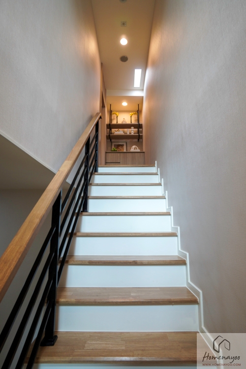 เราขึ้นไปบนชั้น 2 กันต่อค่ะ ตัวบันไดใช้โครงสร้างคอนกรีตเสริมเหล็กแข็งแรง ติดตั้งผิวลูกนอนเป็นแผ่นไม้ยางประสาน และติดราวบันไดแบบฝังผนังให้ขึ้นไปถึงชั้นบน
