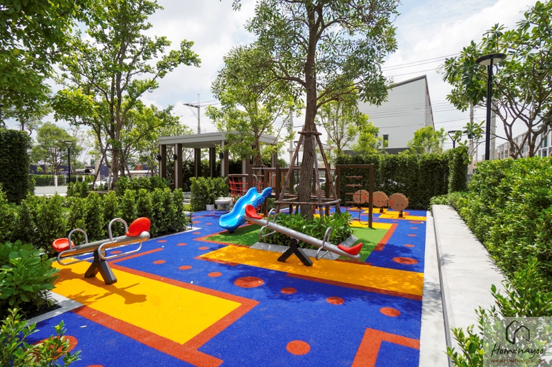 ด้านข้างสวนยังมีโซนสนามเด็กเล่นให้เด็กเล็กมาเล่นสนุกและเข้าสังคมกับเด็กคนอื่น ๆ ได้ ที่พื้นปูด้วยแผ่นยางกันกระแทก ทำเป็นสีสันสดใสดูสนุกสนาน
