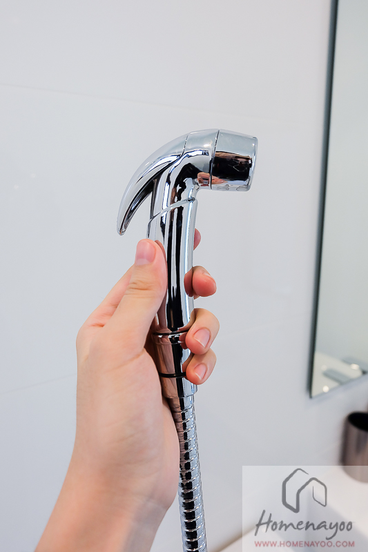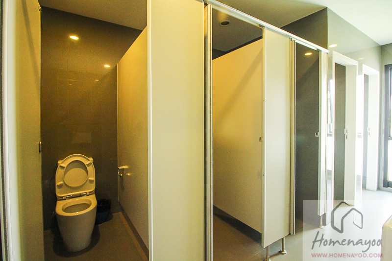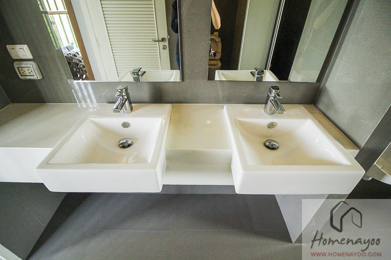 อ่างล้างมือจะได้เป็นอ่างทรงสี่เหลี่ยม ยี่ห้อ American Standard และโถสุขภัณฑ์ได้แบบ Dual Flush ยี่ห้อ American Standard ระยะการใช้งานทั้งสองอย่างเหมาะสม พอใช้ได้สะดวก