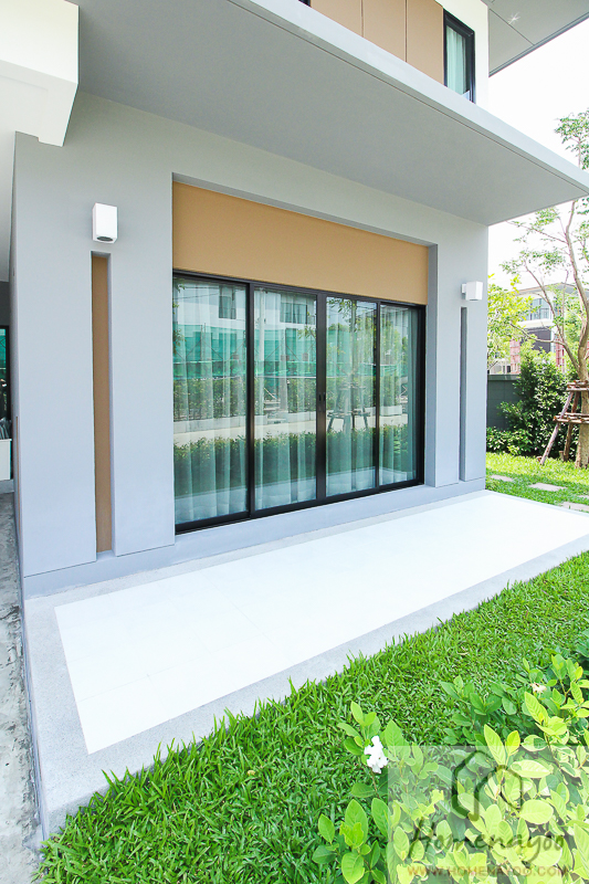 จากห้องนอนจะมีระเบียงในตัว โดยประตูที่เชื่อมระหว่างพื้นที่ในห้องนอนและระเบียงจะได้เป็นประตูบานเลื่อนเดี่ยว บานกรอบอลูมิเนียมสีดำ กระจกเขียวตัดแสง