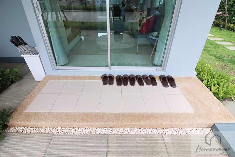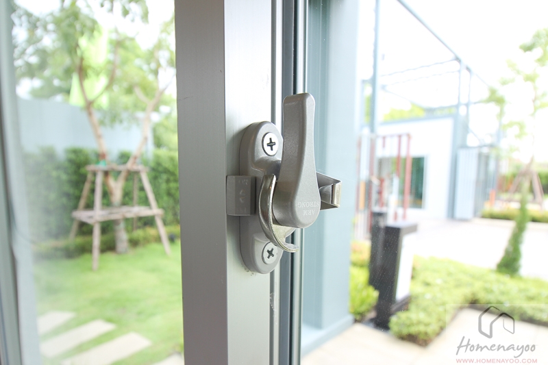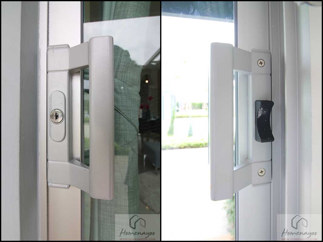 เราจะออกไปดูลานซักล้างกันต่อ ประตูเป็นบานเลื่อนกรอบอลูมิเนียมและมือจับแบบเซาะร่อง