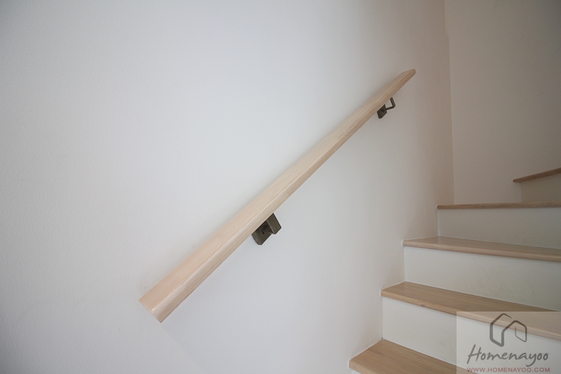 ราวมือจับเป็นโครงเหล็กฝังผนัง ใช้ตัวราวเป็นวัสดุไม้สำเร็จรูปสีเข้ากันกับพื้นบันได