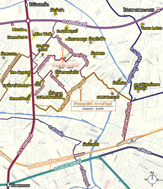 • ทำเลที่ตั้งโครงการ โครงการ บ้านลุมพินี ทาวน์วิลล์ ราชพฤกษ์ ปิ่นเกล้า ตั้งอยู่บน ถนนบางกรวย-จงถนอม ค่ะ บริเวณเลยทางเข้าวัดสักใหญ่มาสักนิด ซึ่ง ถนนเส้นนี้ เป็นถนนเส้นหลักที่เชื่อมต่อกับ ถ.ราชพฤกษ์ และ ถ.บางกรวย-ไทรน้อย ที่วงเวียนเทอดพระเกียรติ โดยจัดเป็นทำเลที่อยู่อาศัยหนาแน่นน้อย สาธารณูปโภคจะอยู่ในระยะขับรถ และบรรยากาศเงียบสงบมีความเป็นส่วนตัวค่ะ