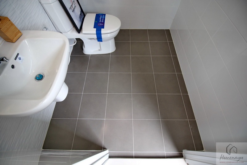 พื้นห้องน้ำมีการลดระดับลงเล็กน้อย เพื่อป้องกันน้ำไหลเข้าไปในบ้านเวลาที่มีการใช้งานหรือล้างห้องน้ำ