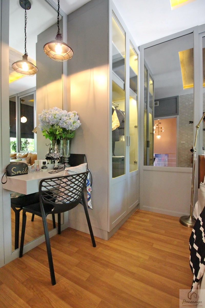 พื้นที่ทางด้านซ้ายของเตียงนอน ทางโครงการออกแบบสำหรับทำเป็นมุมแต่งตัว โดยบิลท์อินเฟอร์นิเจอร์พื้นฐานอย่างโต๊ะเครื่องแป้งและตู้เสื้อผ้าเป็นตัวอย่าง