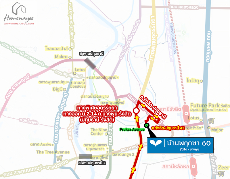 การเดินทางเริ่มจากทางพิเศษอุดรรัถยา ( บางปะอิน-ปากเกร็ด ) ทางออก น.2 – 14 ถ.บางพูน-รังสิต ( ปทุมธานี-รังสิต ) ⇒ ถ.รังสิต-ปทุมธานี ⇒ สามแยกวัดสมเด็จ ⇒ กลับรถ (แยกแฟลตปลาทอง) ⇒ ซ.รังสิต-ปทุมธานี 43 ขับตรงไปประมาณ 750 เมตรถึง Pruksa Avenue ⇒ บ้านพฤกษา 60 รังสิต-บางพูน *ตรงข้ามวัดบางพูน
