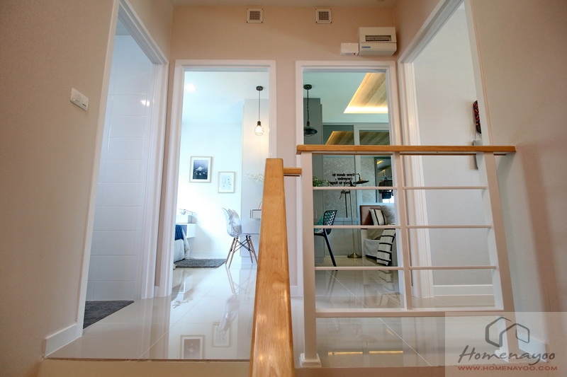 ชั้นบนประกอบด้วย 2 ห้องนอน 1 ห้องอเนกประสงค์ และ 1 ห้องน้ำ จากภาพฝั่งหน้าบ้านอยู่ทางขวา และฝั่งหลังบ้านอยู่ทางซ้าย