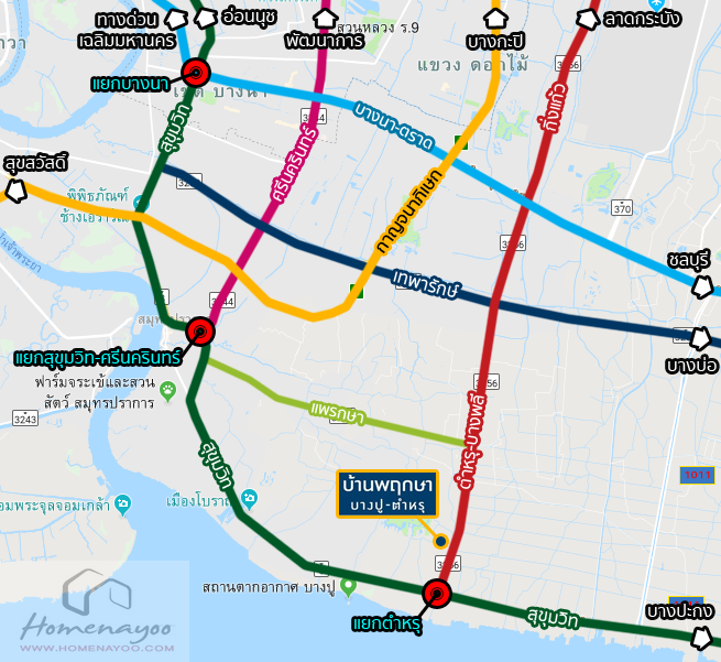 ขับมาบนถนนตำหรุ-บางพลีอีกเพียงเล้กน้อยก็จะถึงทางเลี้ยวซ้ายเข้าโครงการบ้านพฤกษา บางปู-ตำหรุ