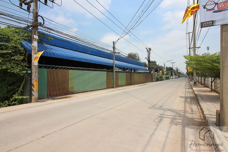 เดี๋ยวเราจะเดินสำรวจบริเวณใกล้เคียงกับตัวโครงการกันนะคะจะได้รู้ว่ามีอะไรอยู่แถวนี้บ้าง เริ่มต้นจากฝั่งตรงข้ามกับซุ้มทางเข้าโครงการจะเป็นโกดังเก็บของและโรงงานอุตสาหกรรม
