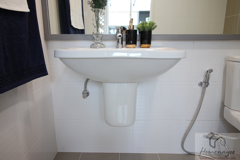 อ่างล้างมือจะเป็นแบบแขวนผนัง ส่วนท่อดักกลิ่นจะครอบด้วยอุปกรณ์อ่างเซรามิกให้เรียบร้อย