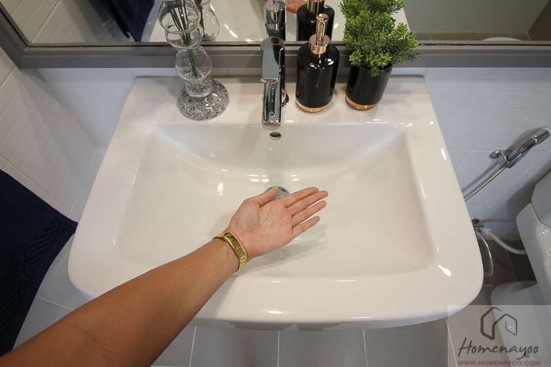 อ่างล้างมือที่ได้จะเป็นของ Kohler แบบแขวนผนัง มีขนาดกระทัดรัดทรงมนปลอดภัยในการใช้งาน มีพื้นที่ขอบอ่างให้วางขวดสบู่ได้นิดหน่อย