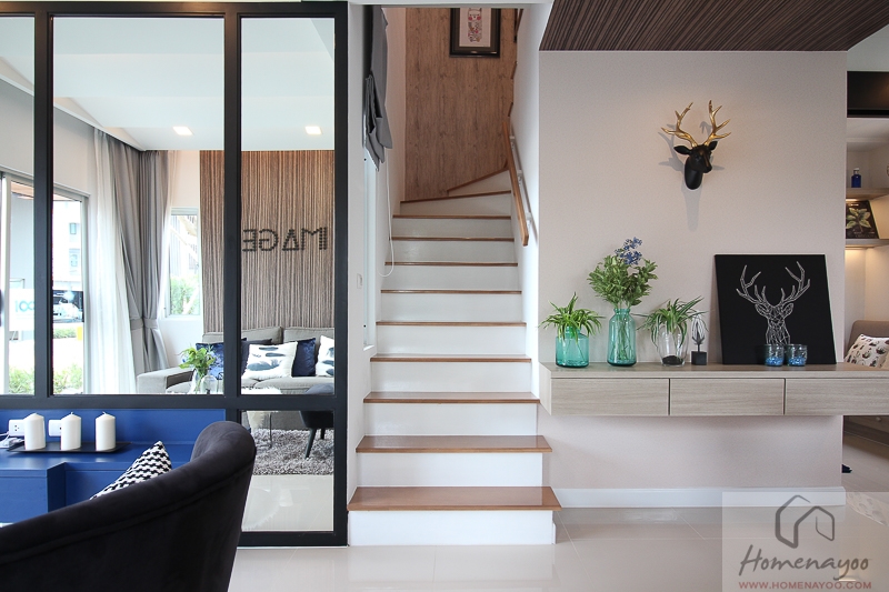 มุมมองขึ้นไปที่โถงบันไดชั้น 2 บันไดจะเป็นบันไดแบบหักกลับรูปตัว U วนขวาขึ้นไป ดวงไฟจะได้เป็นดวงโคมซาลาเปา LED ทรงสี่เหลี่ยมและเจาะช่องที่ฝ้าเพดานเพื่อรับแสงธรรมชาติ