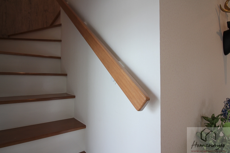 ลูกนอนของบันไดจะเป็นไม้ยางพาราอัดประสาน ส่วนลูกตั้งจะเป็นผนังฉาบเรียบทาสี