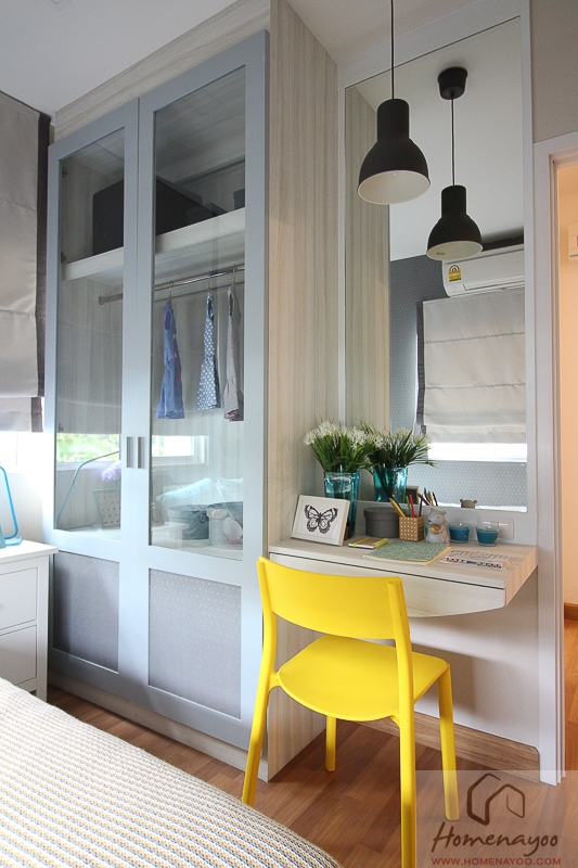 ฝั่งตรงข้ามวางเป็นโต๊ะเขียนหนังสือ ซึ่งจะสามารถวางตู้เสื้อผ้าขนาดย่อมเพิ่มได้อีก 1 ตัว แต่แนะนำให้วางตู้เสื้อผ้าเอาไว้ฝั่งในชิดมุมกำแพงนะ