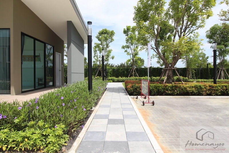 สิ่งอำนวยความสะดวก – หน้าโครงการตรงประตูทางเข้า-ออกติดตั้ง CCTV และมีระบบรักษาความปลอดภัยตลอด 24 ชม. ถนนหลักของโครงการมีต้นไม้, ไม้พุ่มและสนามหญ้าริมทางทำให้โครงการดูร่มรื่น