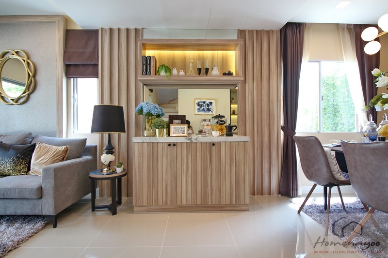 ช่วงพื้นที่ระหว่างห้องนั่งเล่นและห้องทานอาหาร มีสเปซเพียงพอสำหรับวางชั้นวางของอเนกประสงค์หรืออาจจะเพิ่มเป็นมุมทำงานก็ได้