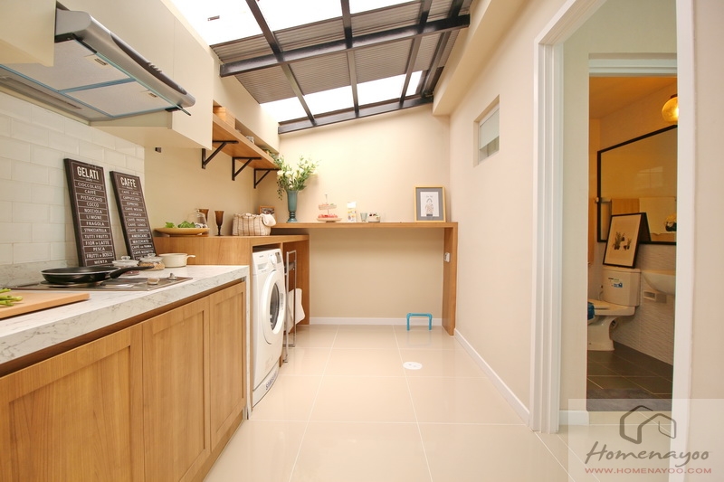 พื้นที่ตรงนี้คือลานซักล้างหลังบ้าน แต่โดยปกติแล้วมักจะมีการต่อเติมครัวไทยด้านหลังกันเป็นเรื่องปกติ ทางโครงการจึงตกแต่งให้ดูเป็นแนวทางในรูปแบบครัวไฮบริดที่ใช้เตาไฟฟ้าและฮูดดูดควันเป็นส่วนประกอบ