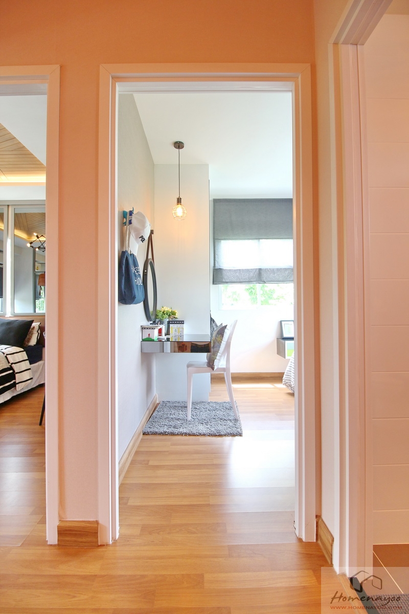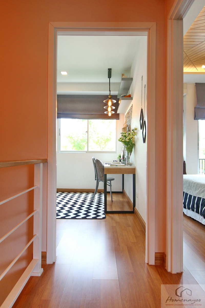 อีกฝั่งเป็นโต๊ะทำงานหรือโต๊ะเขียนหนังสือ มุมนี้เหมาะมากเพราะใกล้กับหน้าต่างหน้าบ้านที่มีแสงธรรมชาติอย่างเพียงพอ