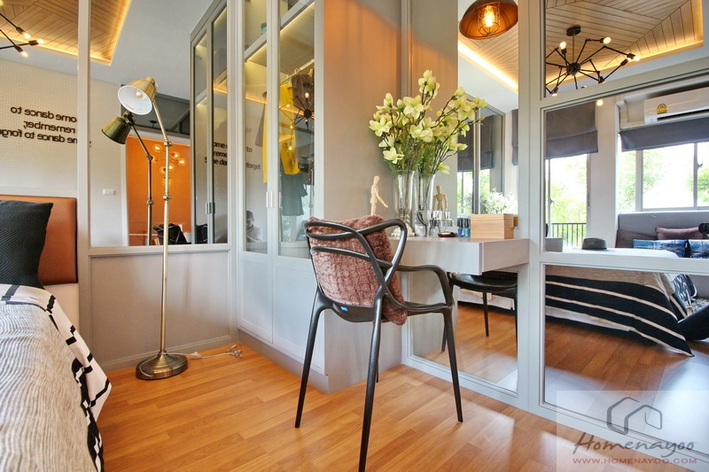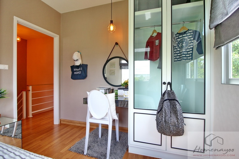 มุมแต่งตัวบิลท์อินเฟอร์นิเจอร์พื้นฐานอย่างโต๊ะเครื่องแป้งและตู้เสื้อผ้าเป็นตัวอย่าง จะเห็นว่าหลังจากวางเตียงแล้ว ยังพอมีสเปซให้เดินใช้งานตรงส่วนนี้ได้จริง