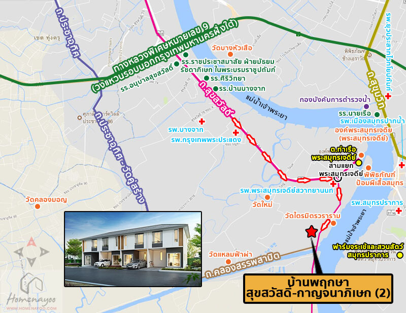 การเดินทาง ผมเริ่มจาก ถนนสุขสวัสดิ์ มุ่งหน้าทางตะวันออกเฉียงใต้ [ฝั่งตรงข้าม โรงพยาบาลกรุงเทพพระประแดง] ⇒ เลี้ยวขวาที่ สามแยกพระสมุทรเจดีย์ ⇒ ทาวน์โฮม บ้านพฤกษา สุขสวัสดิ์-กาญจนาภิเษก (2) *โครงการอยู่ใกล้ วัดไตรมิตรวราราม