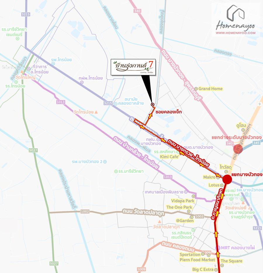 ผ่านโลตัส ไทรน้อยจากนั้นเลี้ยวซ้ายเข้าสู่ ถ.บางกรวย-ไทรน้อย