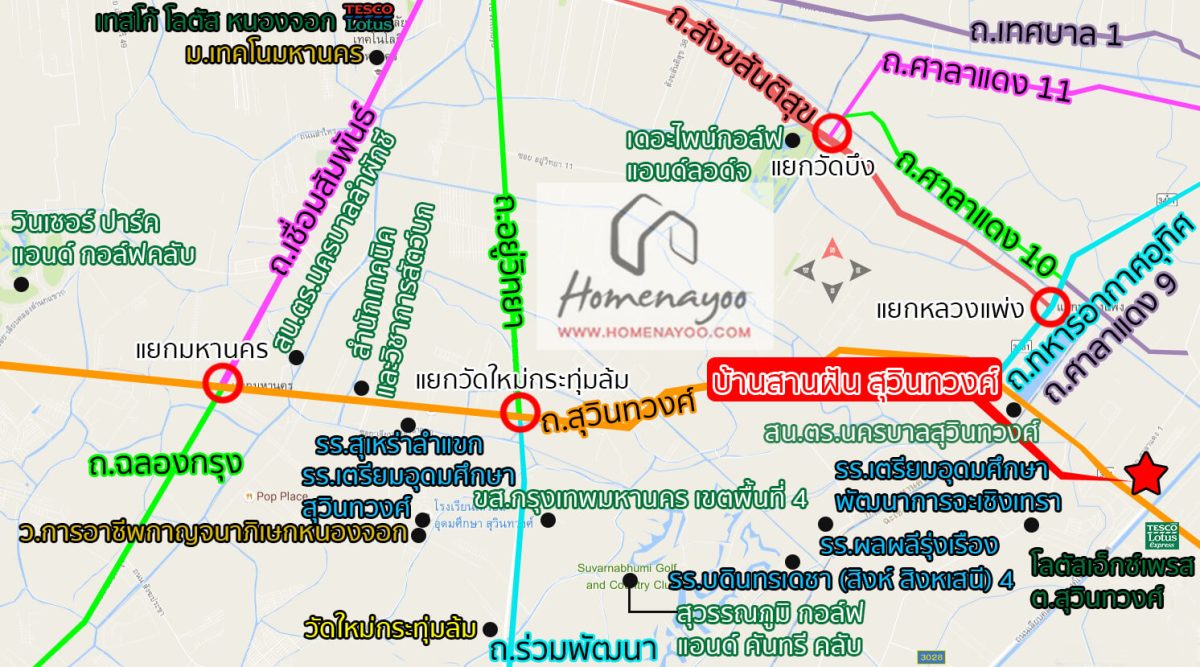 การเดินทาง ผมเริ่มจาก ถนนสุวินทวงศ์ (หน้าปากทาง ซอยสุวินทวงศ์ 57) > บ้านสานฝัน สุวินทวงศ์ *โครงการอยู่ระหว่าง ซอยศาลาแดง 1-2