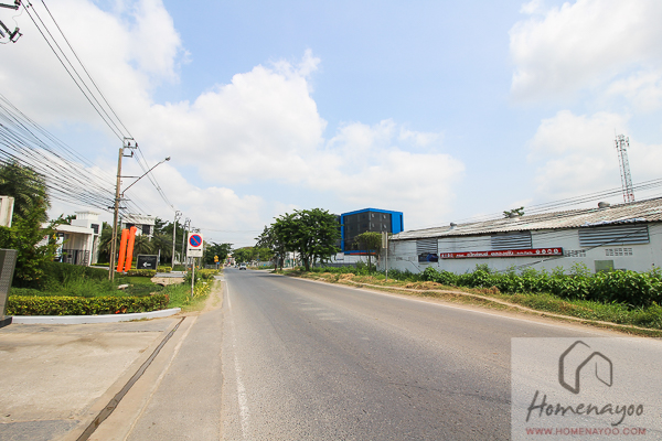 ด้านหน้าโครงการติดถนนกรุงเทพกรีฑา ฝั่งตรงข้ามที่เราเห็นคือโรงงานขนาดกลาง