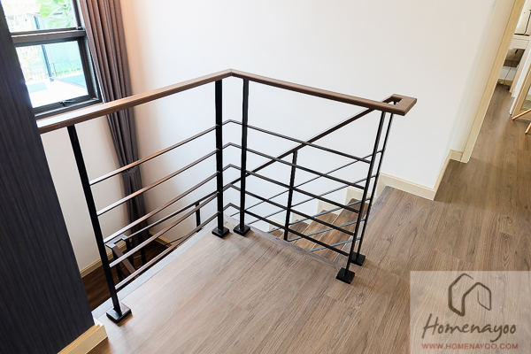 ราวกันตกเป็นเหล็กและกระจกดูโมเดิร์นดี ส่วนพื้นจริงๆของระเบียงจะได้พื้นกระเบื้องเซรามิคนะคะ