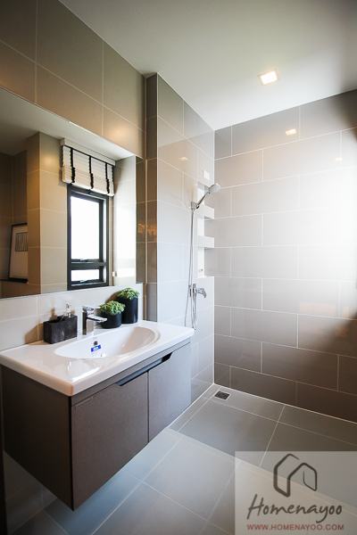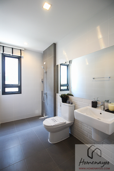 ภายในห้องน้ำชั้นล่างนี้จะได้ฟังก์ชั่นมาครบ ทั้งส่วนห้องน้ำและพื้นที่อาบน้ำ มีช่องแสง 1 จุด เป็นหน้าต่างบานกระทุ้งคู่