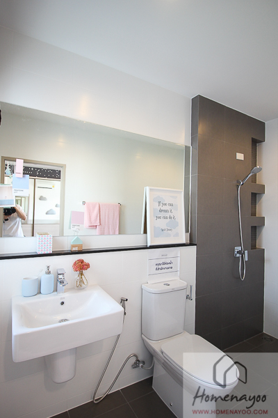 ภายในห้องน้ำตกแต่งสีโทนขาว ดำ แยกส่วนเปียก ส่วนแห้งให้เรียบร้อย สุขภัณฑ์ในห้องน้ำทั้งอ่างล้างมือ, โถสุขภัณฑ์ และฝักบัวของ American Standard ค่ะ