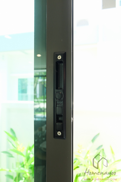 ส่วนช่องแสงฝั่งหลังบ้านก็ได้เป็นประตูบานเลื่อนคู่บานกรอบอลูมิเนียมสีดำ