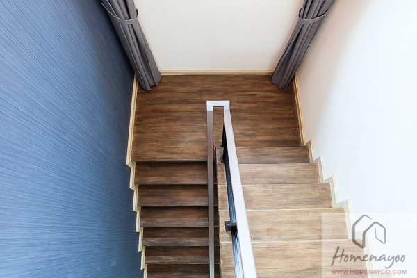 จากส่วนนั่งเล่นพักผ่อนสามารถขึ้นไปส่วนฟิตเนสทางบันไดซ้ายมือและห้องน้ำทางขวามือ