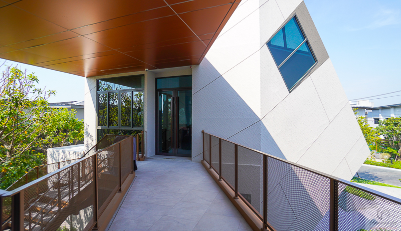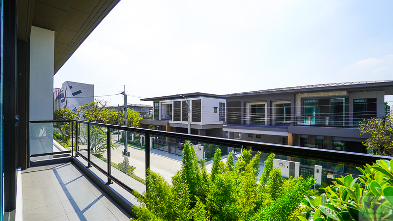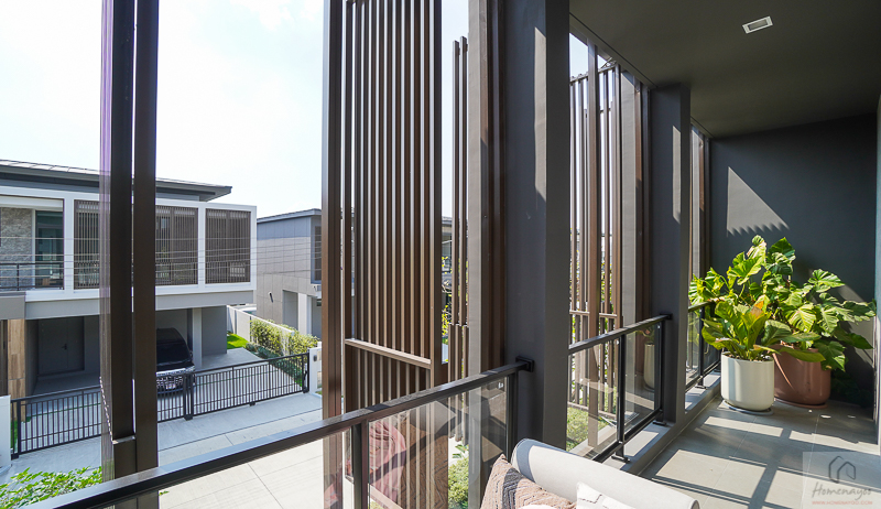 ระเบียงจะได้พื้นที่ขนาดใหญ่เป็นแนวยาว สามารถวางชุดโต๊ะนั่งเล่นและกระถางต้นไม้ตกแต่งได้ ราวกันตกเป็นกระจกพร้อมระแนงบังสายตา