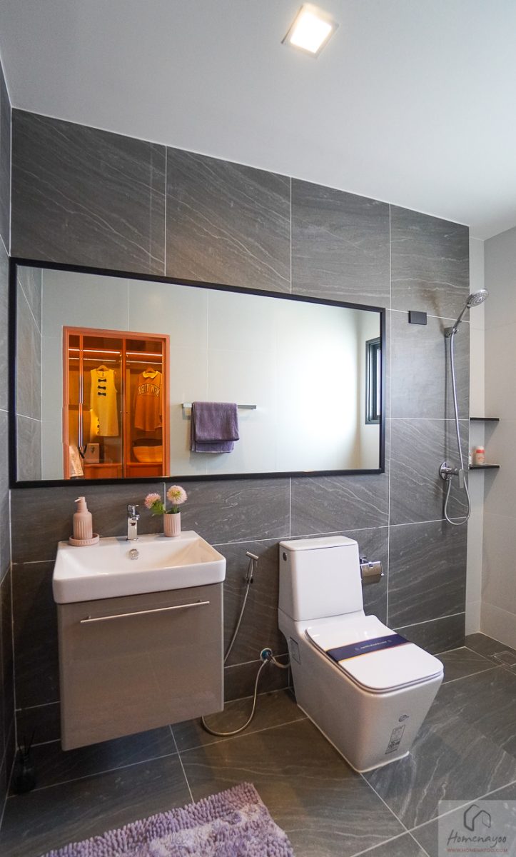 ภายในห้องนำ้แบ่งส่วนเปียกส่วนแห้ง พื้นและผนังตกแต่งด้วยกระเบื้องลายหิน พร้อมกระจกเงาบานใหญ่เต็มผนัง