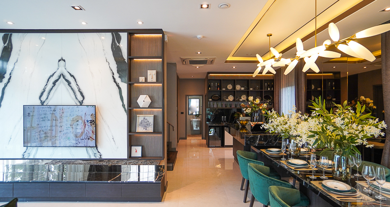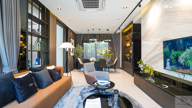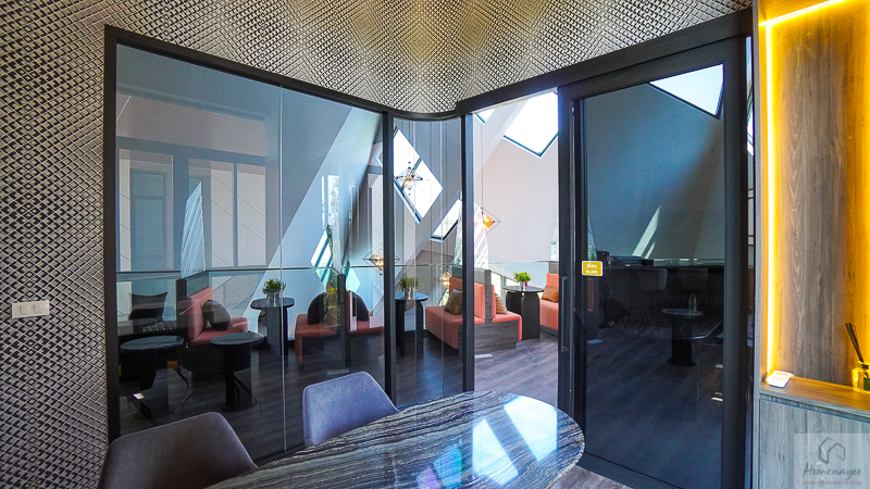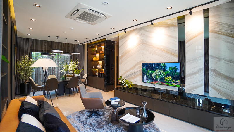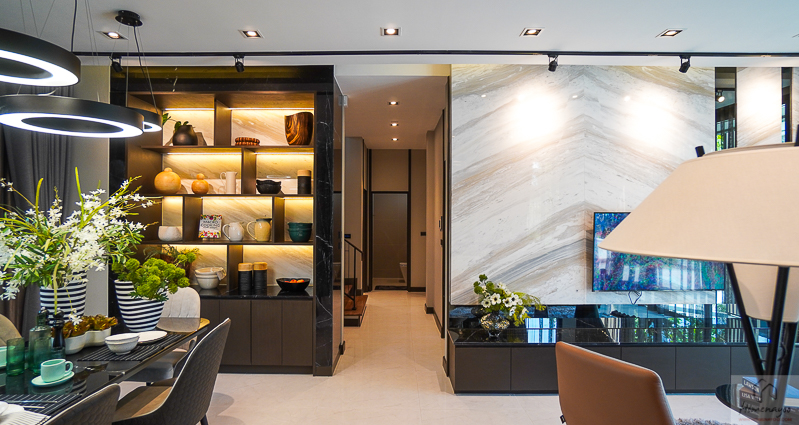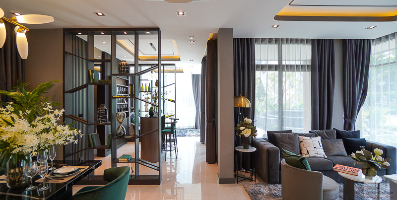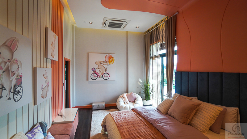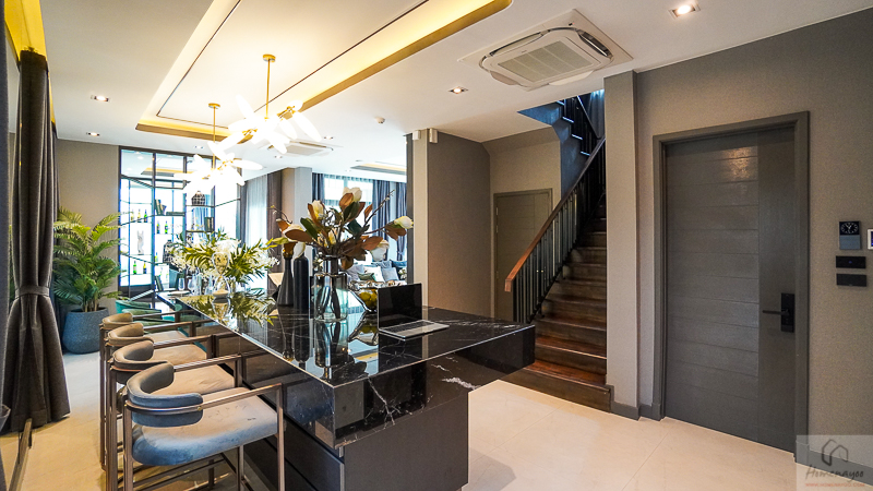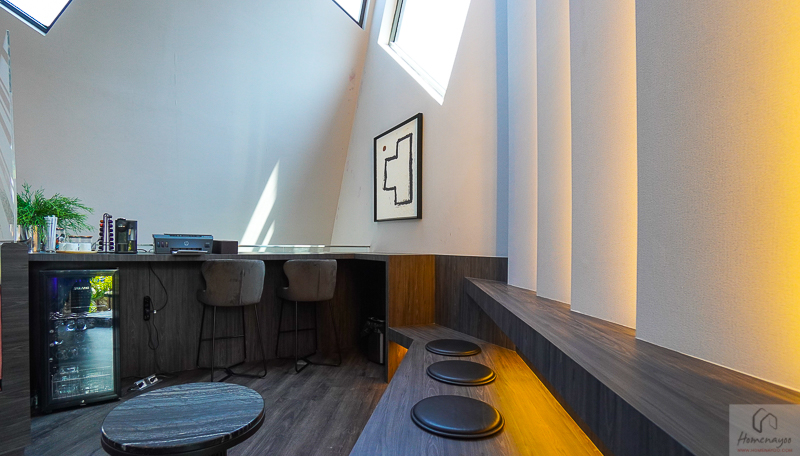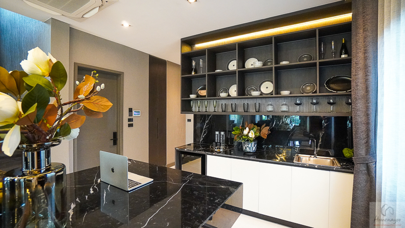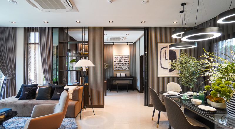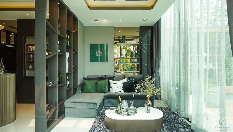 ติดกับส่วนรับประทานอาหารฝั่งนี้จะเป็นห้องนอน 5 บ้านตัวอย่างเอาผนังกั้นห้องออก และทำเป็นโซนบาร์เครื่องดื่ม ห้องพักผ่อนมาให้ดู