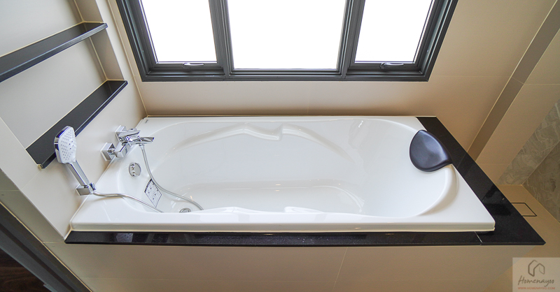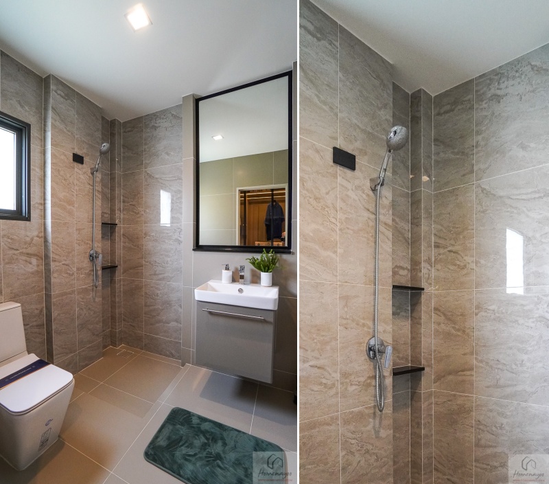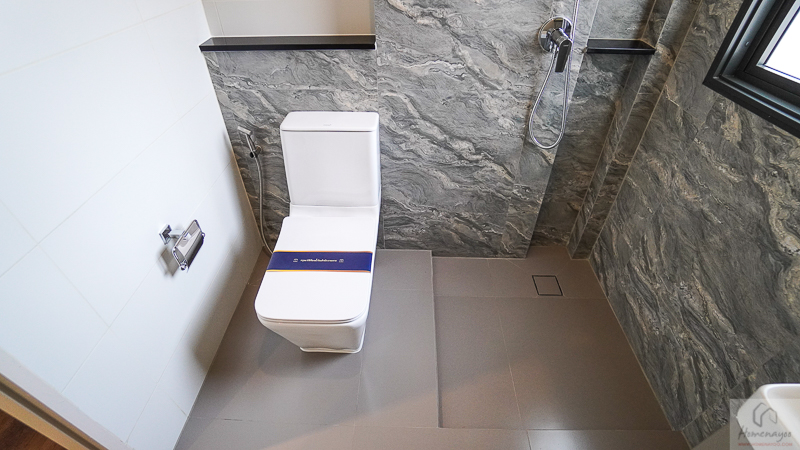 ถัดไปเป็นพื้นที่ส่วนเปียก ติดตั้ง Hand Shower พร้อมเดินงานระบบไฟฟ้าติด Junction Box รองรับการติดตั้งเครื่องทำน้ำอุ่นมาให้เรียบร้อย และมีช่องไว้สำหรับวางอุปกรณ์อาบน้ำ พร้อมราวจับ