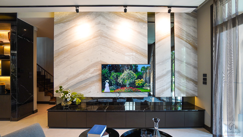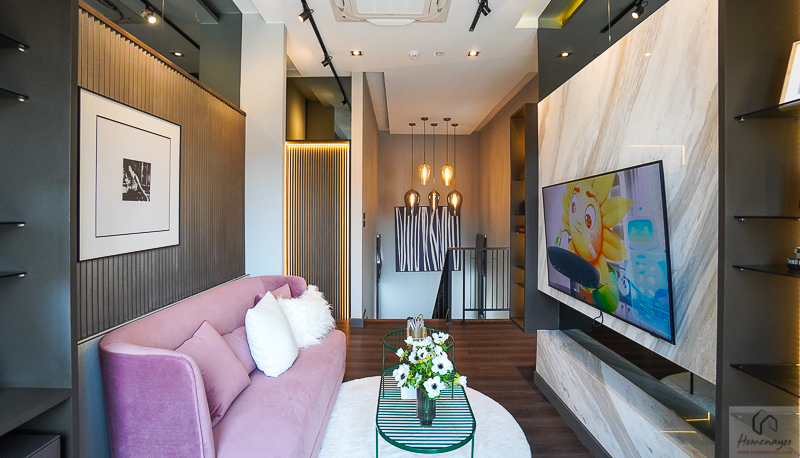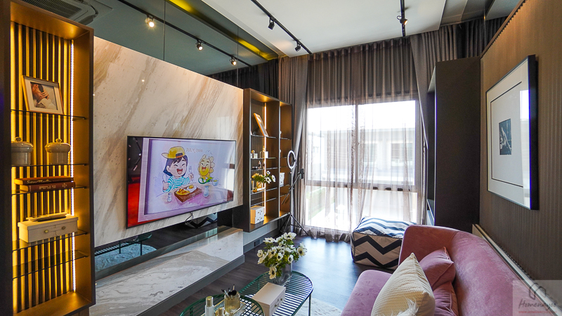 ส่วนระยะดูทีวีก็ให้มากว้าง ติดทีวีจอขนาด 65 นิ้วได้เลย ที่ผนังจะทำเป็นชั้นวางของโชว์ก็ได้