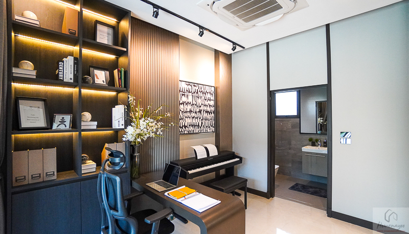 บ้านตัวอย่างทำเป็นพื้นที่สำหรับงานศิลปะ มุมทำงาน ปรับเปลี่ยนได้ตามต้องการ ฝ้าเพดานชั้นสองสูง 3.6 ม. ทำให้ดูโปร่ง โล่งมากขึ้น