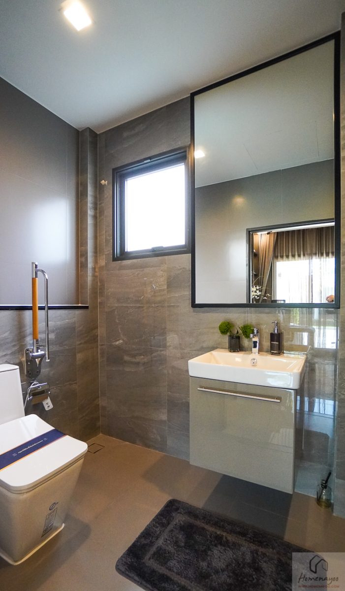 ภายในห้องน้ำแบ่งส่วนเปียกส่วนแห้ง ออกแบบไว้รองรับผู้สูงอายุ ตกแต่งพื้นและผนังด้วยกระเบื้องลายหิน ในห้องน้ำมีช่องแสงเปิดระบายอากาศได้