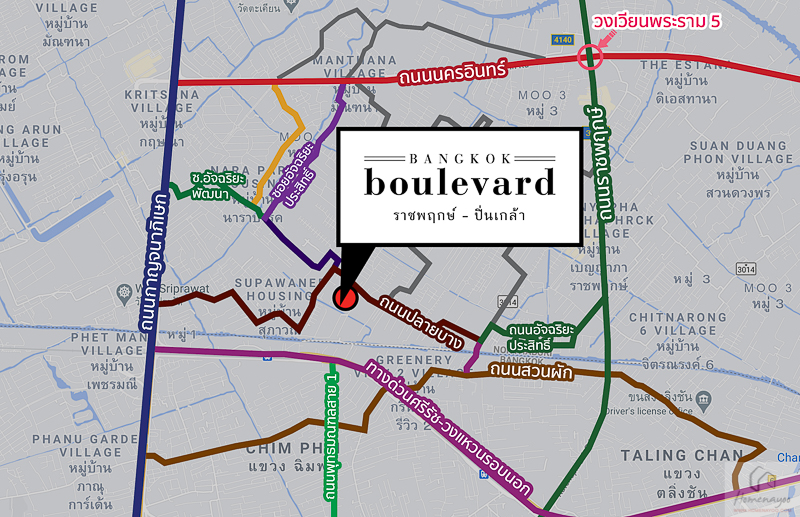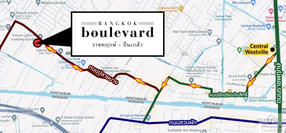 ทำเลที่ตั้งโครงการ : Bangkok Boulevard ราชพฤกษ์-ปิ่นเกล้า ตั้งอยู่ในย่านชุมชนพักอาศัย บรรยากาศโดยรอบค่อนข้างเงียบสงบเหมาะแก่การพักอาศัย มีความอุดมสมบูรณ์สูง ตามสองฝั่งทางทั้งถนนปลายบาง, ถนนอัจฉริยะประสิทธิ์ และถนนสวนผัก จะมีร้านค้า ร้านอาหาร ให้เลือกหลากหลาย ร้านสะดวกซื้อก็มีครบทุกแบรนด์ ใกล้ตลาดหลายแห่ง
