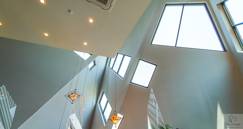 เน้นช่องแสงขนาดใหญ่ ทำให้แสงส่องเข้าถึงแต่ละส่วนภายในบ้านได้เยอะ พื้นที่แต่ละส่วนสามารถใช้งานได้จริง จัดวางเฟอร์นิเจอร์ได้ง่ายตามต้องการ แต่ละห้องดูโปร่งโล่ง ฝ้าเพดานสูง 2.8-3.6 ม.