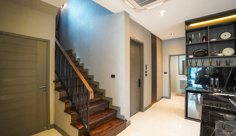 บันไดบ้านโครงสร้างเหล็ก ลูกตั้งและลูกนอนเป็นไม้สำเร็จรูป ผนังบ้านฉาบเรียบพร้อมติด Wallpaper ทั้งหลัง สุขภัณฑ์ในห้องน้ำของ Cotto บ้านทุกหลังติดตั้งระบบสัญญาณกันขโมยแบบ Magnetic & Shock Seosor, ระบบ Smoke & Heat Detector และรองรับ EV Charger