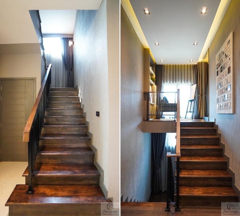 บันไดบ้านคอนกรีตเสริมเหล็ก ลูกตั้งและลูกนอนเป็นไม้สำเร็จรูป ตรงบันไดมีช่องแสงช่วยให้โถงดูสว่าง ตรงโถงบันไดชั้น 2 จะมีชั้นลอยเชื่อมขึ้นไปอีก