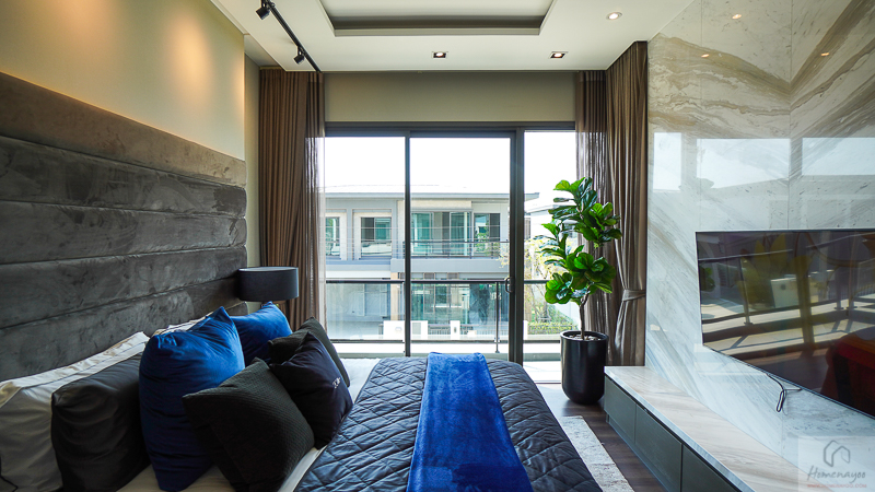 Master Bedroom ได้พื้นที่กว้างขนาดใหญ่ แบ่งพื้นที่วางเตียง King Size พร้อมโซฟาปลายเตียงมาให้ดู