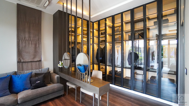 อีกโซนของห้อง Master Bedroom บ้านตัวอย่างแบ่งพื้นที่กั้นแยกส่วนเป็น Walk-in closet ขนาดใหญ่มาให้ดูเป็นไอเดีย แบ่งฟังก์ชันได้ตามต้องการ มีประตูเชื่อมออกไปตรงระเบียงได้อีกทาง