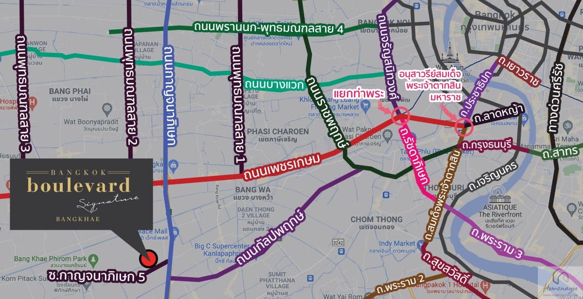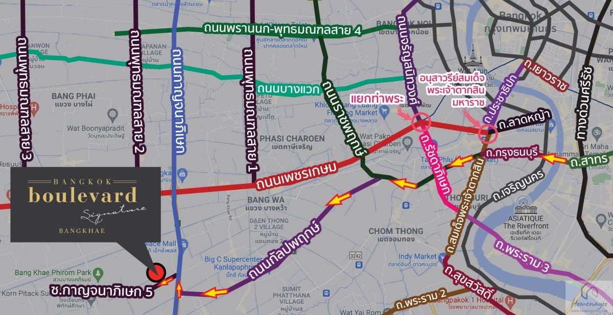ถนนสะพานตากสิน > ถนนกรุงธนบุรี > ถนนกัลปพฤกษ์ > ถนนกาญจนาภิเษก > ซอยกาญจนาภิเษก 5 > Bangkok Boulevard Signature บางแค