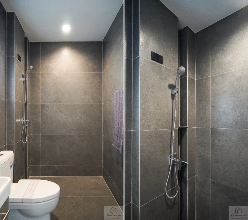 ถัดไปเป็นพื้นที่ส่วนเปียก ติดตั้ง Hand Shower พร้อมเดินงานระบบไฟฟ้าติด Junction Box รองรับการติดตั้งเครื่องทำน้ำอุ่นมาให้เรียบร้อย มีช่องไว้สำหรับวางอุปกรณ์อาบน้ำด้านข้าง